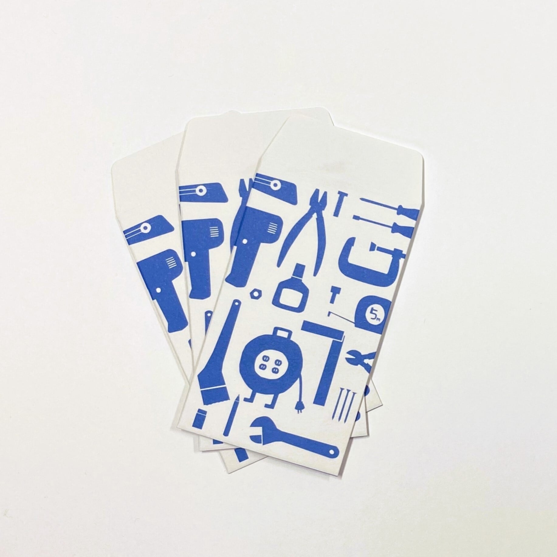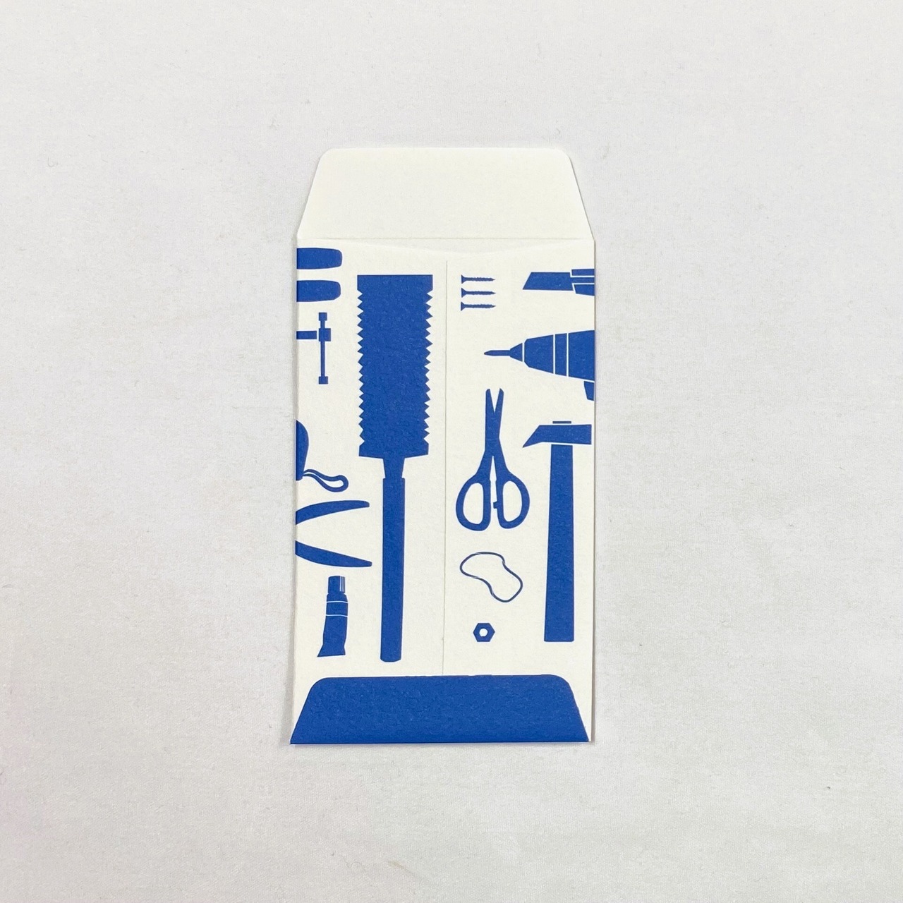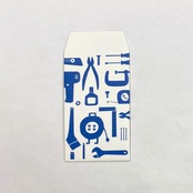 特有の質感と雰囲気のある、機械漉きの奉書紙で作ったぽち袋です。ざらっとした落ち着きのある面に可愛らしい工具や道具をちりばめました。